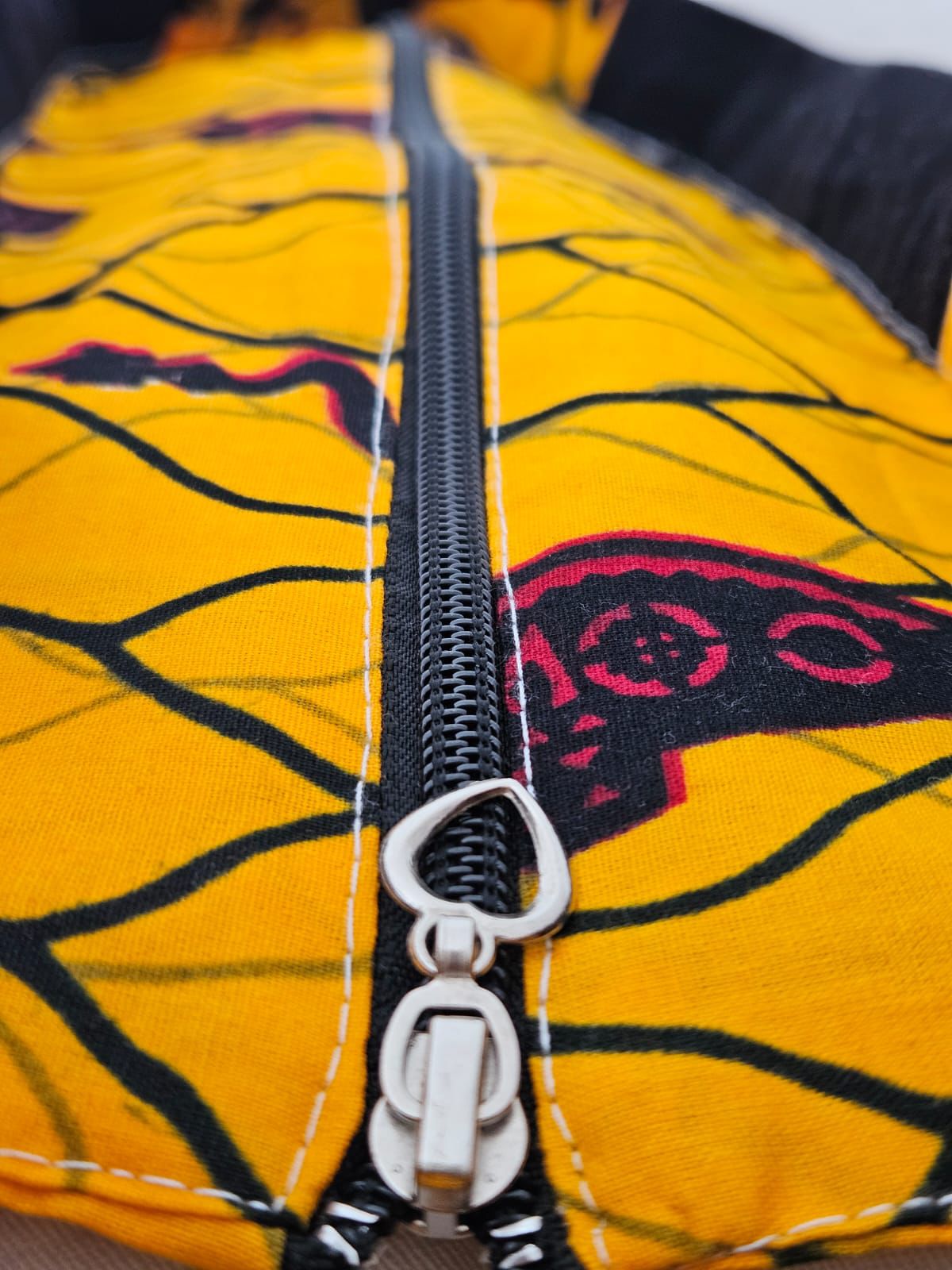 Nala—meaning "precious gift"—pays tribute to the warmth and creative strength of Cameroon. Its solar yellow canvas unites with a vibrant African fabric whose patterns evoke the winding paths of Douala and the rhythmic dances that make the country's heart beat.